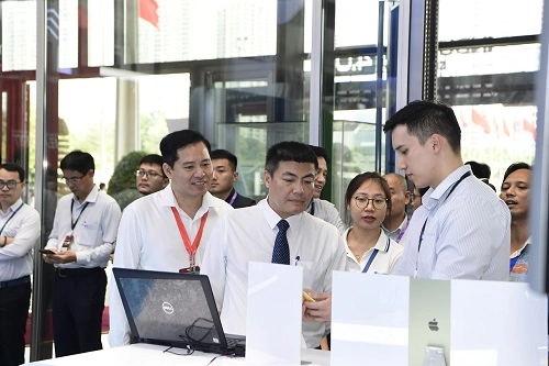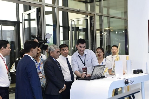 Thủ tướng Chính phủ Phạm Minh Chính và các đồng chí lãnh đạo các bộ, ngành tới tham quan khu vực trình diễn các giải pháp số của VNPT tại Industry 4.0 Summit 2023